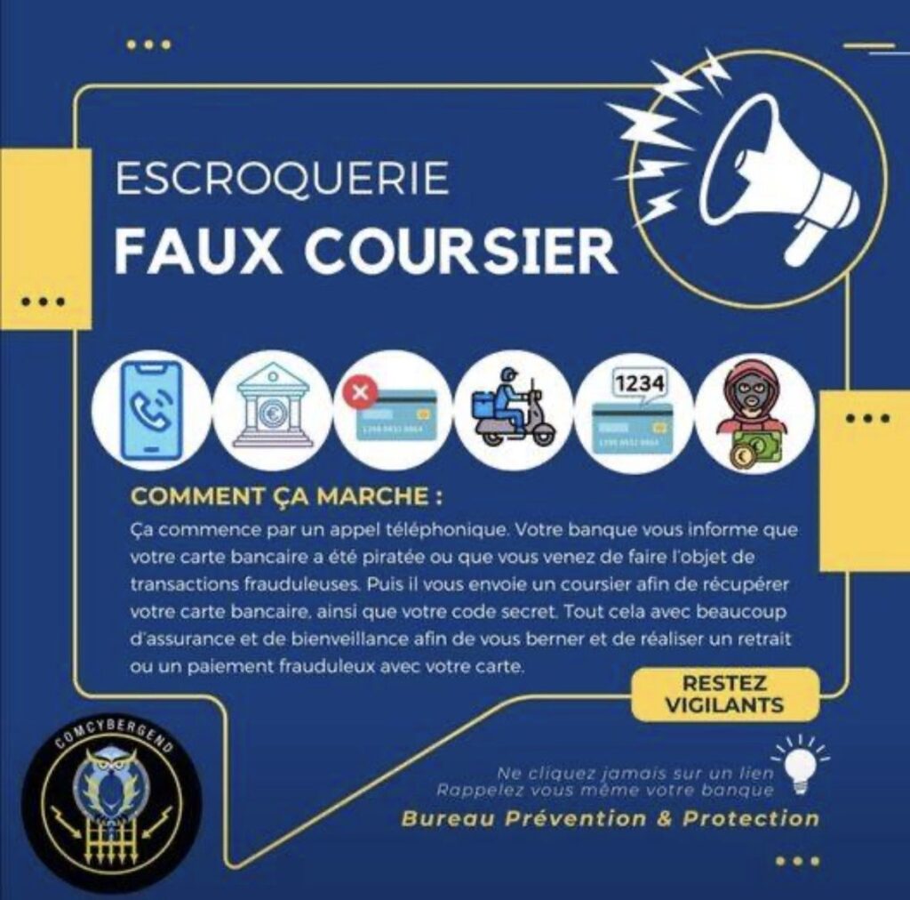 Actuellement, des tentatives d’escroqueries dites « faux coursiers » sévissent sur le secteur. En pratique, la future victime reçoit un appel d’un faux conseiller bancaire qui l’informe d’un piratage de sa carte bancaire et qu’elle doit s’en séparer pour son renouvellement « rapide ».