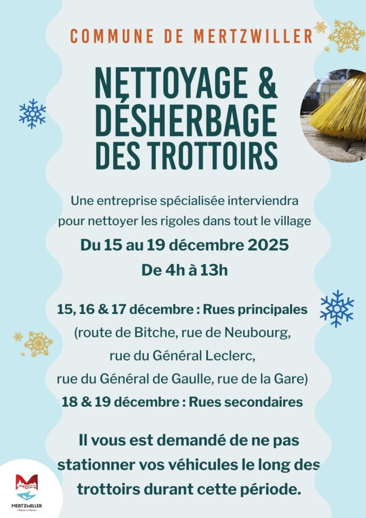 La balayeuse effectuera un nettoyage dans les rues de la commune du 15 au 19 décembre, d’abord dans les rues principales puis dans les rues secondaires. Nous vous remercions de ne pas stationner vos véhicules le long des trottoirs durant cette période.